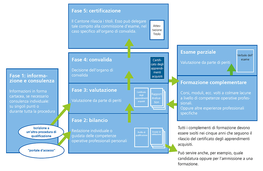 Per informarsi in merito alla procedura di validazione, occorre rivolgersi al portale d’accesso del proprio Cantone. La validazione degli apprendimenti acquisiti è possibile soltanto per determinate professioni. Maggiori informazioni alla pagina: Offerte e indirizzi per la validazione degli apprendimenti nella Svizzera italiana. Se il Cantone di domicilio non propone alcuna procedura per la professione scelta, è possibile rivolgersi ad altri Cantoni.